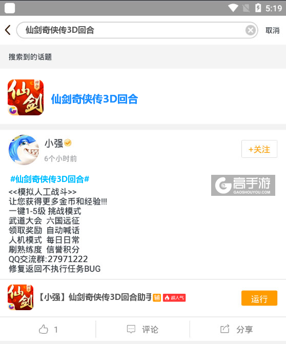 4、切换回首页,在搜索框中搜索“仙剑奇侠传3D回合”,点击仙剑奇侠传3D回合ICON进入仙剑奇侠传3D回合辅助话题页,下方则会出现一系列我们官方工作人员编写的或者官方工作人员审核认证的仙剑奇侠传3D回合脚本,您可以根据自己的需求选择对应的脚本,然后点击运行。如图三图四所示。