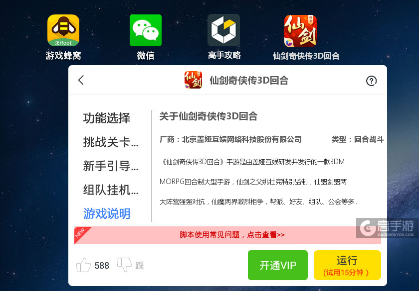 提示:本次下载的仙剑奇侠传3D回合辅助工具软件是高手游联合市场排名第一“蜂窝游戏”推出的仙剑奇侠传3D回合定制版辅助软件工具,特意针对仙剑奇侠传3D回合进行了操作流程优化、发热优化等。