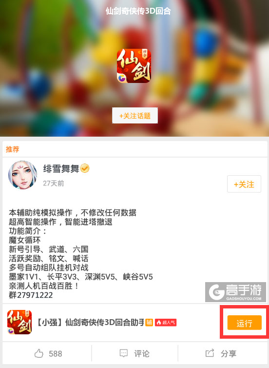 最后,关于此款仙剑奇侠传3D回合辅助工具软件如果在使用的过程中有什么不满意的地方或者有需要改进的地方可以关注我们的微信公众号(gaoshouyou)提问或者在下方留言给我们,我们会即时更新并处理。我们会认真对待您的每一条评论,并反馈给脚本作者,以便提升您的游戏质量。
