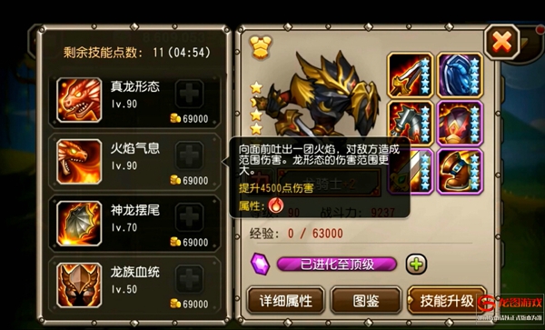 龙骑士的能量条满格后,由骑士形态变身为神龙形态,身形变大的龙骑士,各个技能的作用范围也变得更远,攻击间隔时间也大幅缩短。通过对比可以看出龙骑士的火焰吐息技能在龙形态下伤害范围更大。