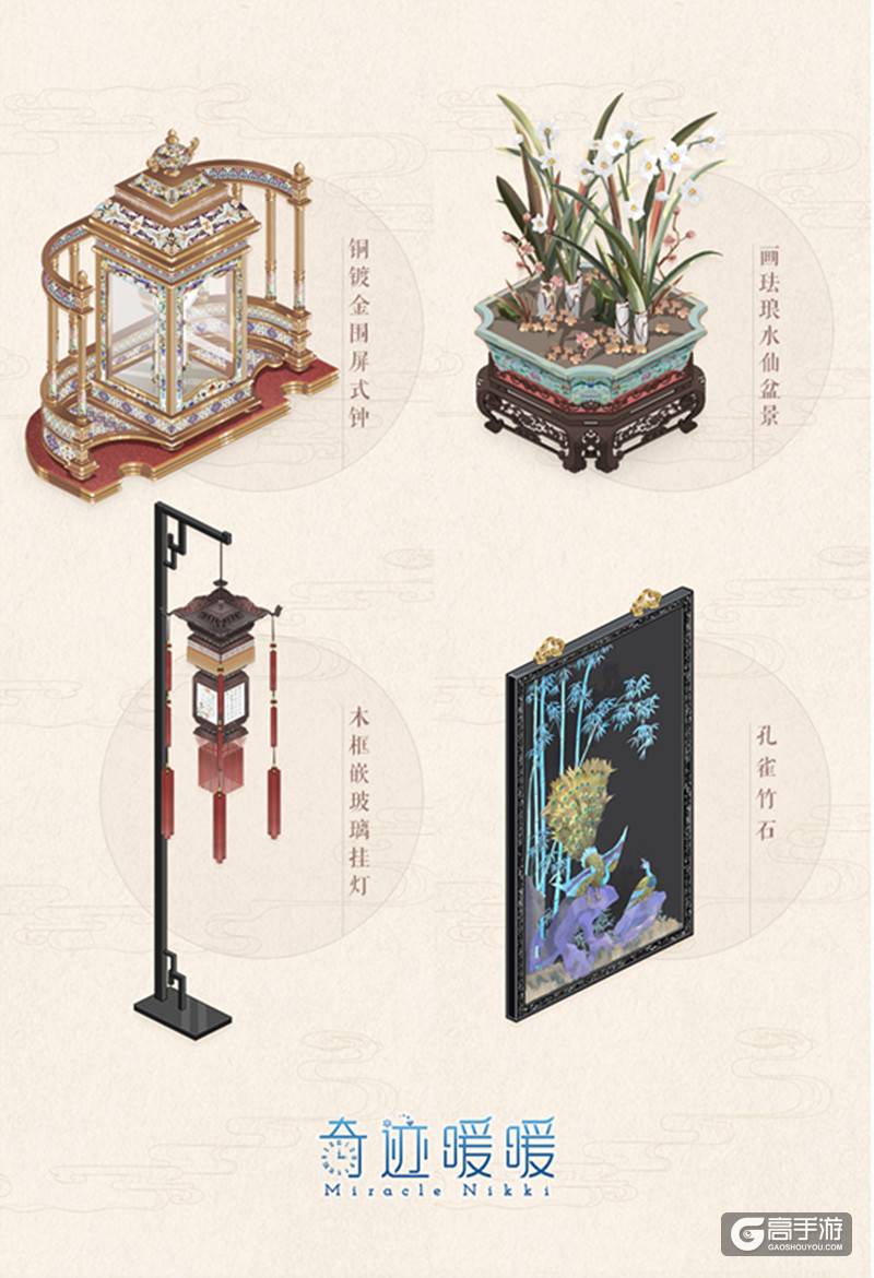 除【青瑶碧影】、【水玉长明】外,参与限时活动还可免费获取【雅音自鸣】套装及养心殿藏品同款家具。