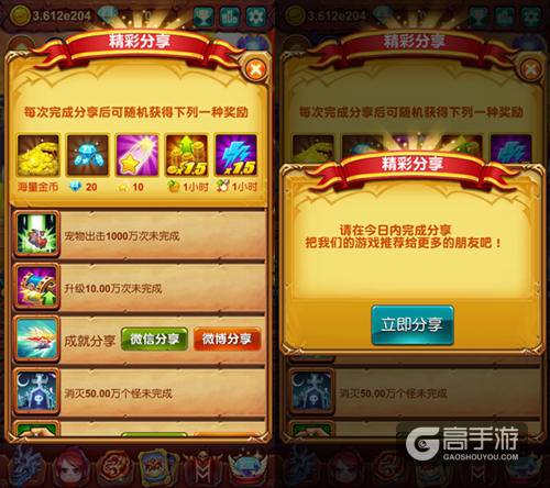 顺便一提的是,当勇者们完成指定的成就任务时,可以通过“精彩分享”将以完成的成就任务分享给别人,并且分享成功后可以获得一份奖励哟。这个奖励可就丰富了,有金币,钻石,圣光,金币祝福,鼓舞这5种奖励!咳咳,当然是随机的发送一种奖励,但是这5个奖励不管是哪个奖励在闯关路上对大家的帮助都是很大的!尤其是钻石跟金币,那可是不可多得的资源!
