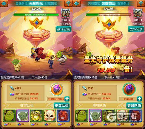 其次就是作为远古三大祭坛之一的“光辉祭坛”,这个祭坛的作用跟“圣光图腾”一样,可以直接增加圣光加护的效果,并且是直接按倍数进行增加,可以让大家很直接的看到圣光加护效果的增长!而且祭坛可玩性更高,因为我们可以选择魔宠入住祭坛从而提升祭坛的收益量,不同品级的魔宠可以增加的收益也不一样,越高品级的魔宠带来的收益也将更多!