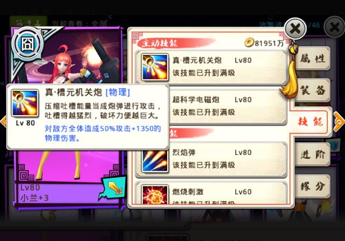“觉醒”之后的小兰可谓是大变身,除了一身装备有了革命性提高之外,她的技能也有了极大的变化,攻击力有了尤为显著的提高。小兰的主动技能“槽元机关炮”将觉醒成为“真·槽元机关炮”,攻击形式也从原来对敌方单体造成巨大伤害转变成为对敌方全体造成大规模伤害。这使得小兰从之前的强力单体输出转变为伤害爆棚的AOE战士。绝对是追求极致输出玩家的首选!