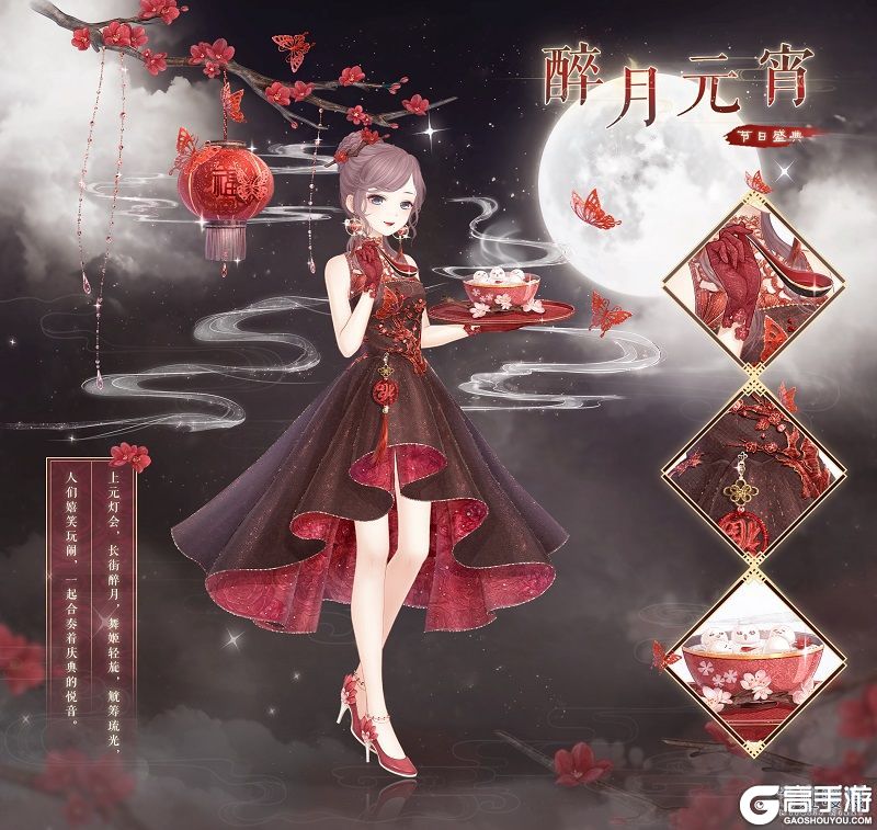 【醉月元宵】含正常姿势与特殊姿势,特殊姿势手套“醉月元宵”,精美可移动摆件“长街梅韵”、“逐渐成形”,海报展示妆容为“胭脂扣” 。