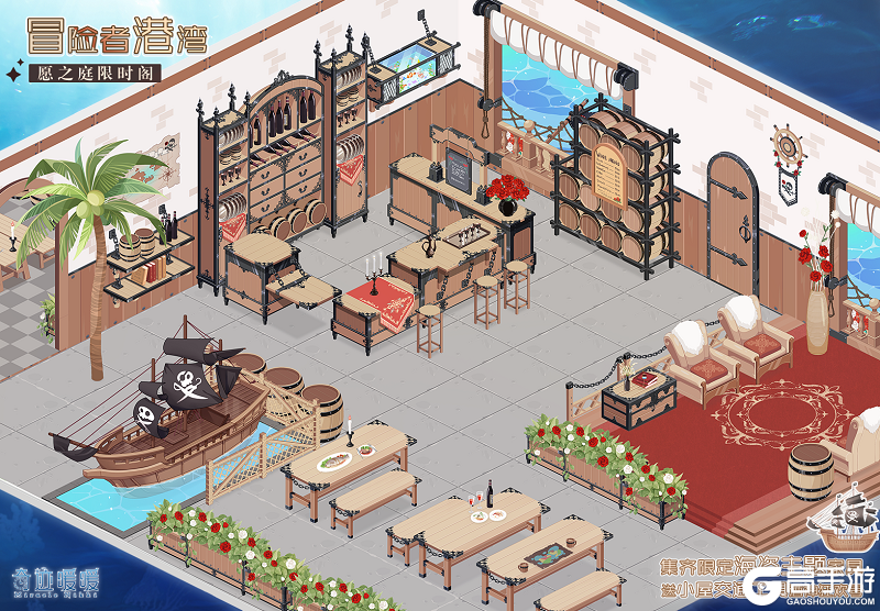 6月17日5:00—6月23日23:59,前往小屋限时阁“冒险者港湾”许愿,可获得精美家具。集齐所有限定家具可解锁小屋交通工具“酒神狂欢号”!