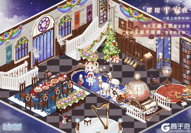 12月18日5:00—12月24日23:59,在小屋愿之庭的限时抽奖阁“璀璨平安夜”许愿,可获得精美圣诞主题家具。集齐所有限定家具可以解锁小暖暖装扮“雪夜的礼物”!